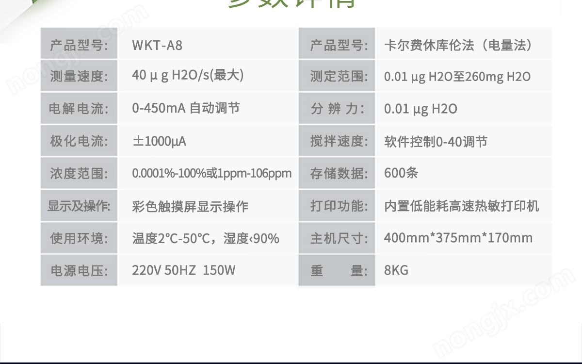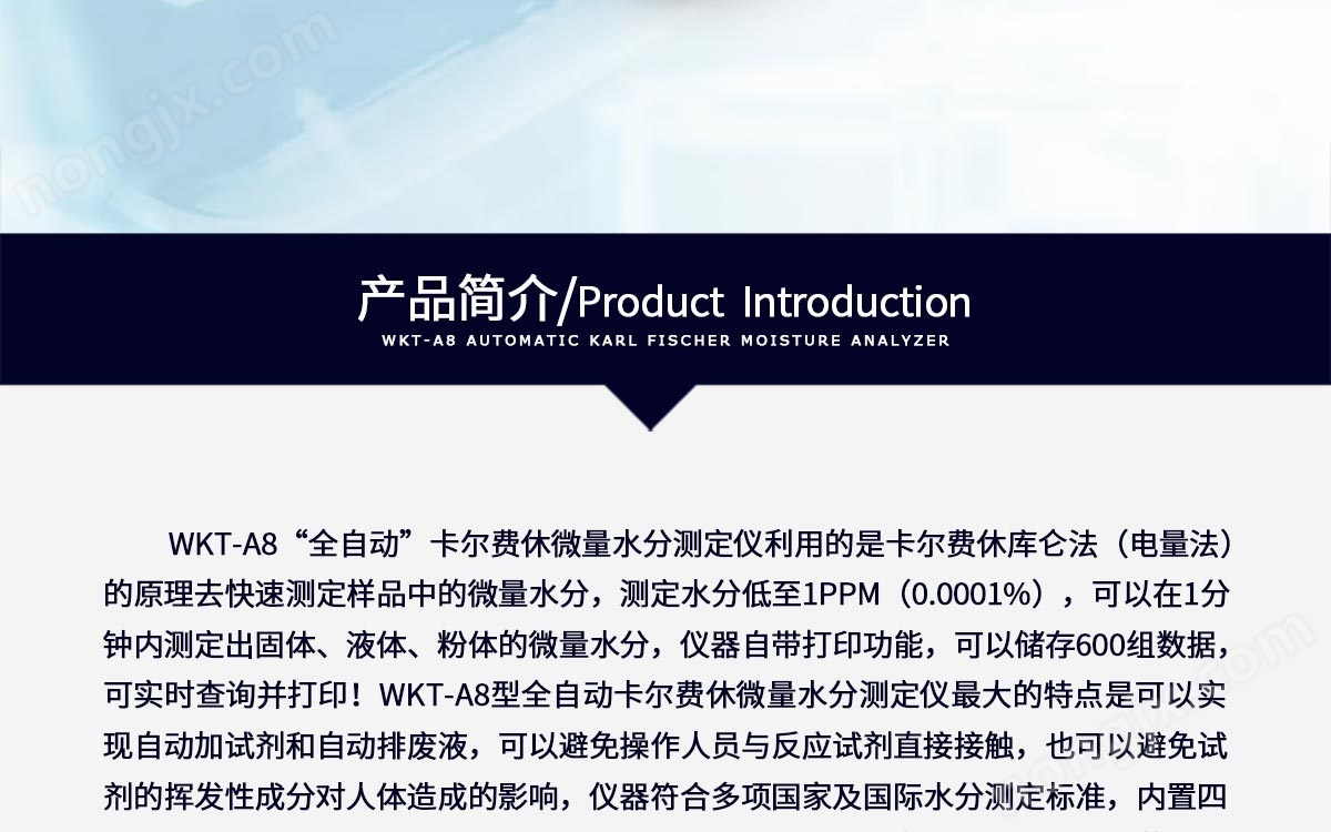 WKT-A8型全自動微量水分測定儀是采用卡爾-費休庫侖法(電量法)測定樣品中含水量的.分析儀器,所以該儀器又稱為卡爾費休水分測定儀、庫侖法水分測定儀。WKT-A8型全自動微量水分測定儀采用了高分辨率的屏幕彩色液晶顯示器,中文界面,漢字顯示,觸摸屏控制,人機對話更直觀,操作更簡便;與同類型儀器相比,大大提高了測試靈敏度;本儀器可儲存600條歷史實驗記錄,為您的實驗提供了更多便利。該儀器技術創(chuàng)新、操作簡便、實驗快速、結果可靠、性能穩(wěn)定,廣泛應用于石油、化工、充油電器設備絕緣油、醫(yī)藥、農藥、化肥、礦物原料、鋰電池電解液、塑膠原料、制冷設備用油、制冷劑等液體、氣體,固體(測定醛類、酮類樣品需選用醛酮專用試劑)物質中水分的測定,是微量水分測定領域理想的選擇。