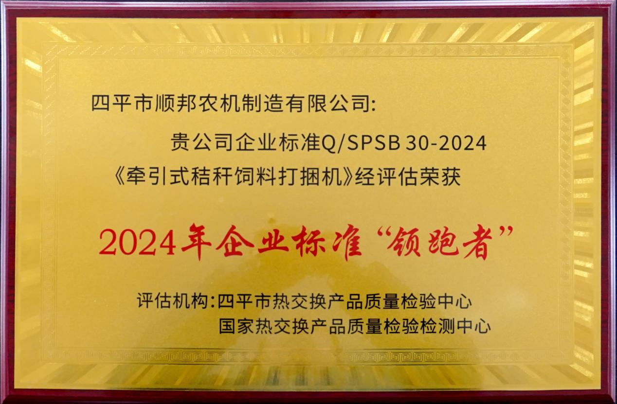 2024年12月,順邦農(nóng)機榮獲全國首個《牽引式秸稈飼料打捆機》企業(yè)標準“領(lǐng)跑者”殊榮,這也是吉林省農(nóng)機行業(yè)的首個企業(yè)標準“領(lǐng)跑者”稱號。